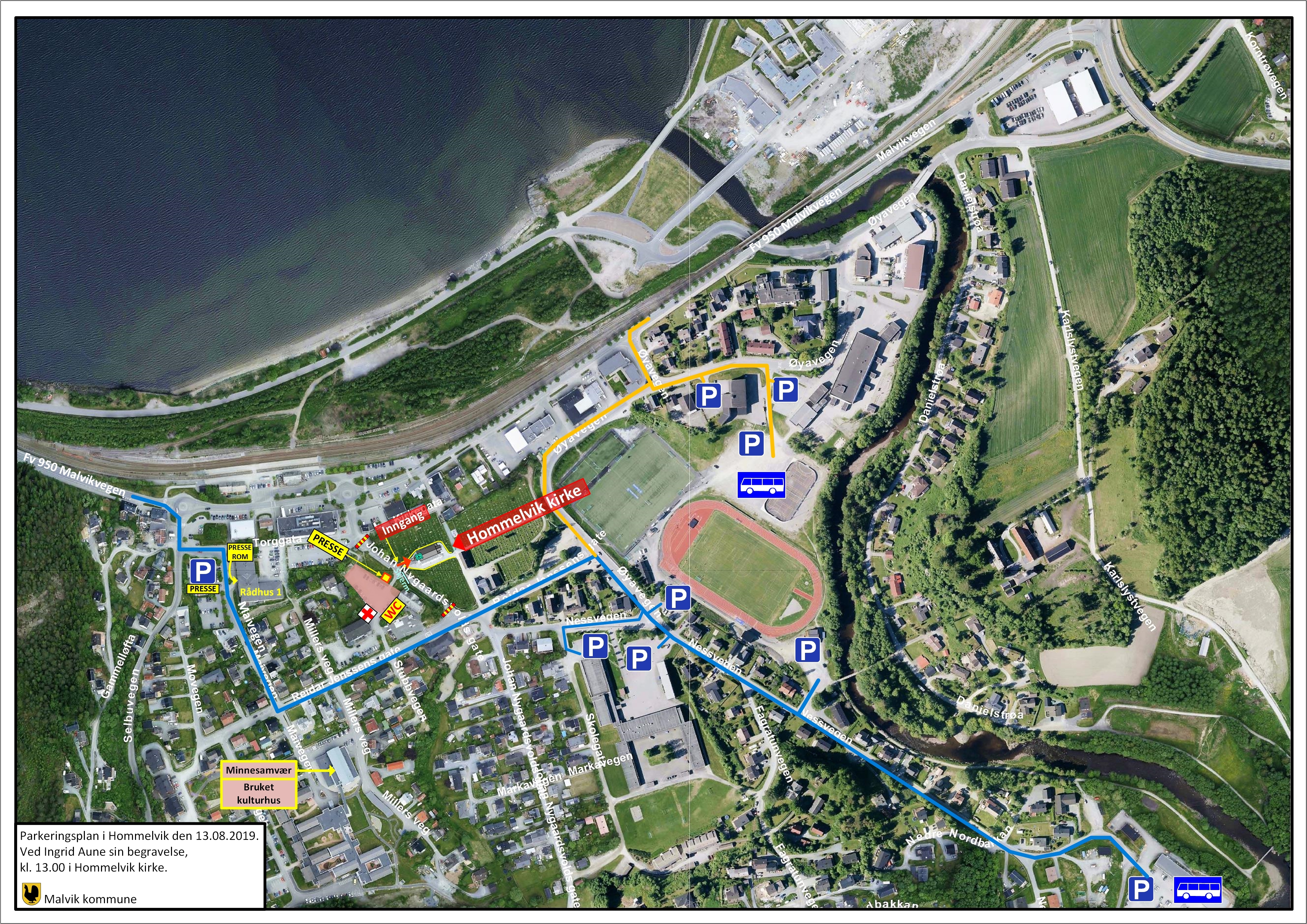 For å kunne håndtere trafikken på en ryddig måte, har vi laget et kart som viser hvor det er mulig å parkere. Parkeringsmulighetene er merket med P. De største parkeringsplassene vil være på grusbanen på Øya og Malvik kommunes driftsavdeling på Nesset. Fra disse parkeringsplassene vil det gå busser til kirken.